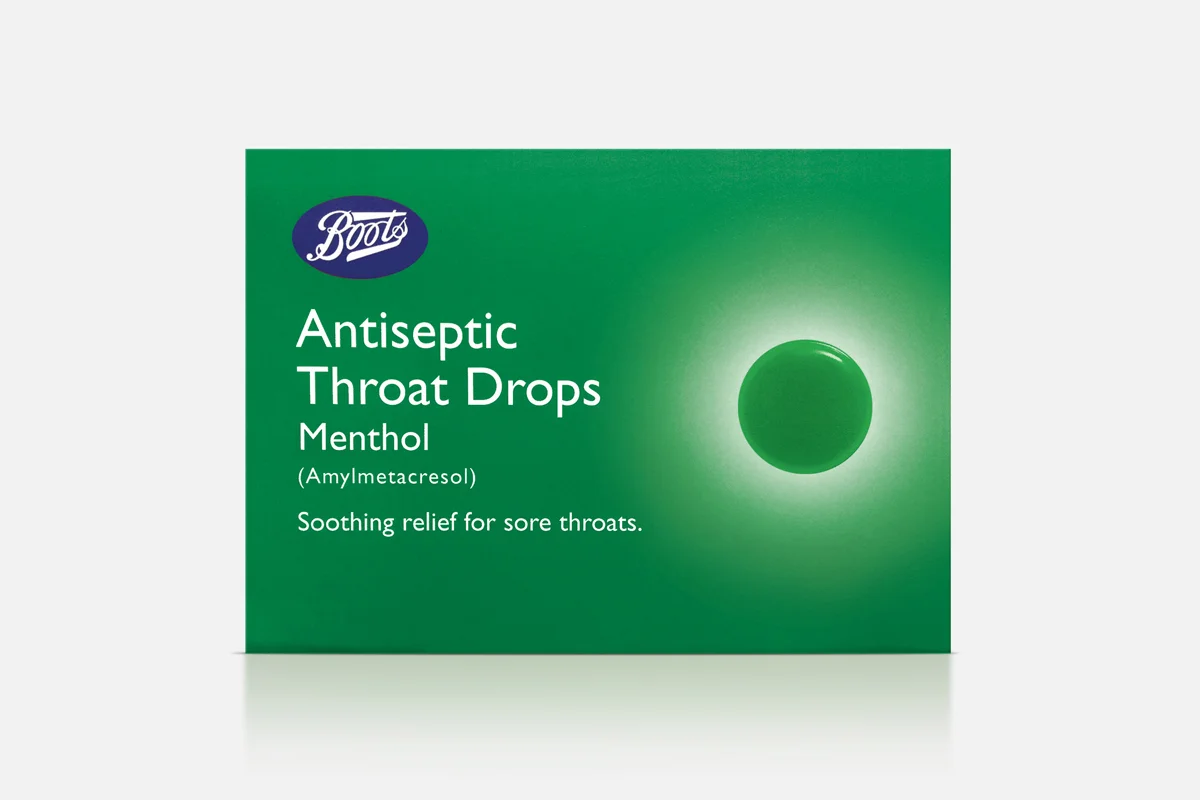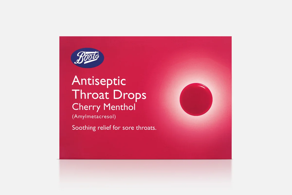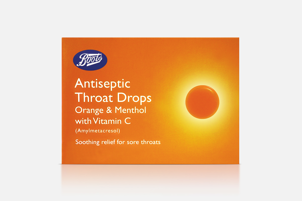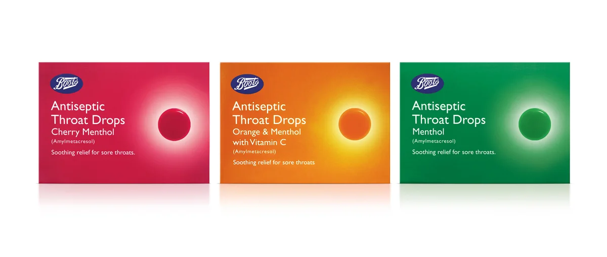 Sore throats need soothing. Our packaging design for Boots range of Antiseptic Throat Drops highlights the warming glow contained in every lozenge.
