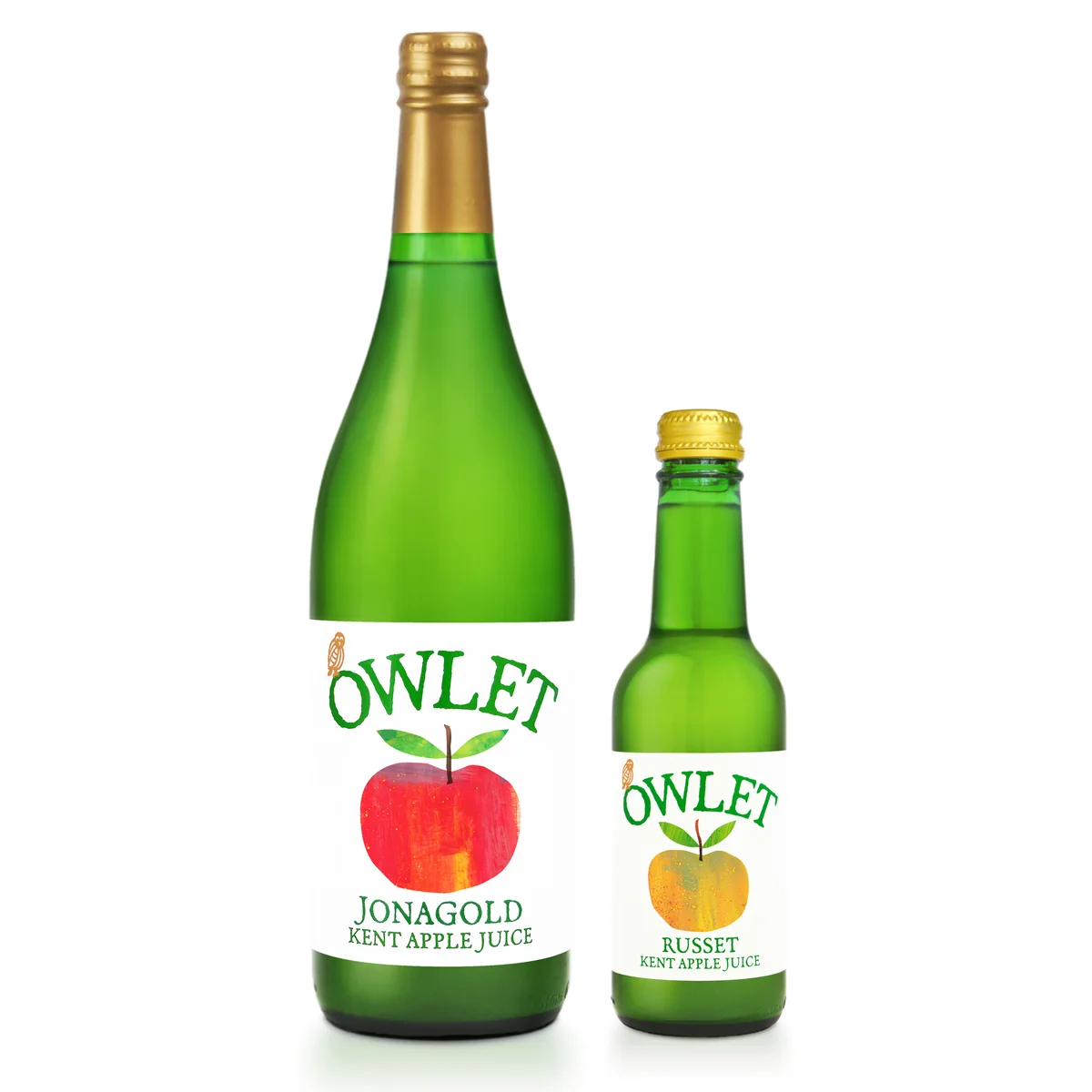 Brand identity and packaging for a fruity range of apple juices that are all planted, picked, pressed and packaged on the Owlet farm in Kent.